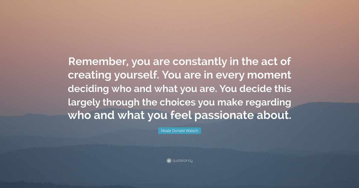 「remenber, you are constantly in the act of creating yourself. You are in every moment deciding who and what you are. You decide this largely through the choices you make regarding who and what you feel passionate about.」